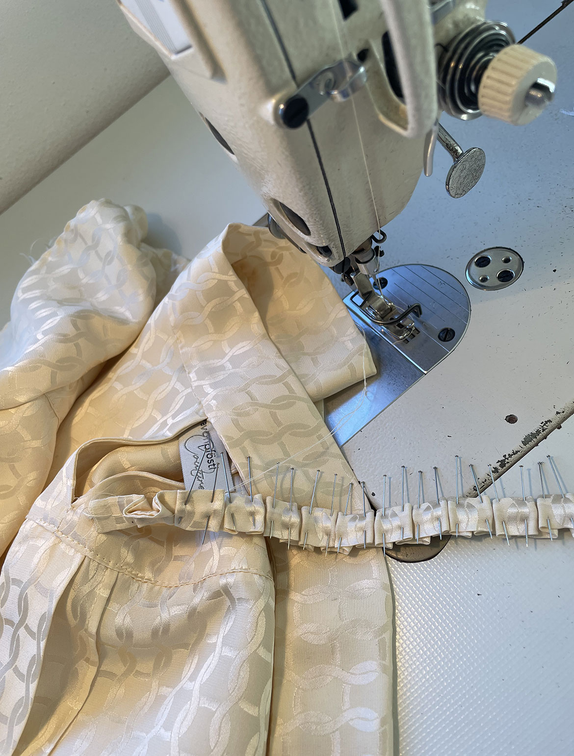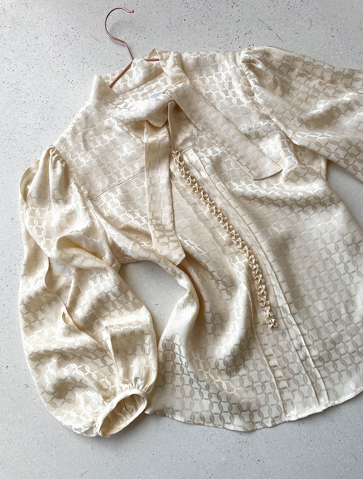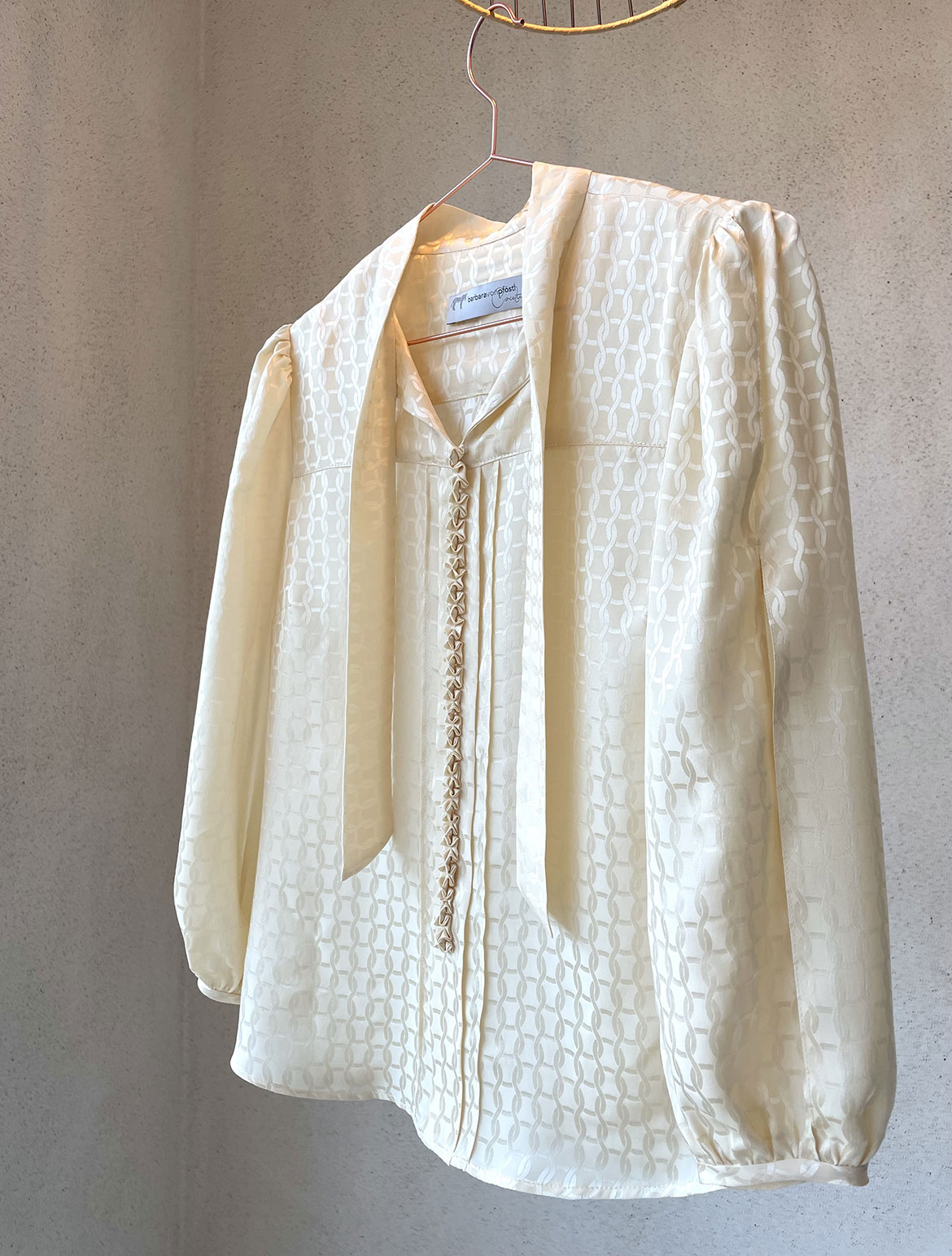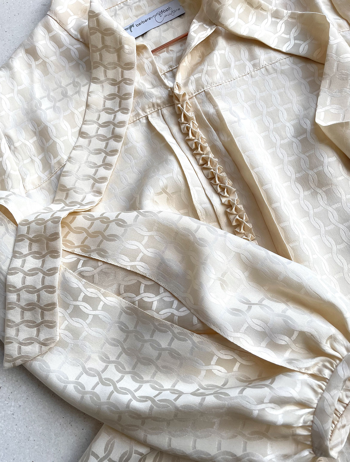 - cremefarbige elegante Seidenjaquard-Bluse mit handgestochener Schmuck-Borte im Vorderteil, sowie langen Schlitzen am Oberarm und Schluppe am Hals