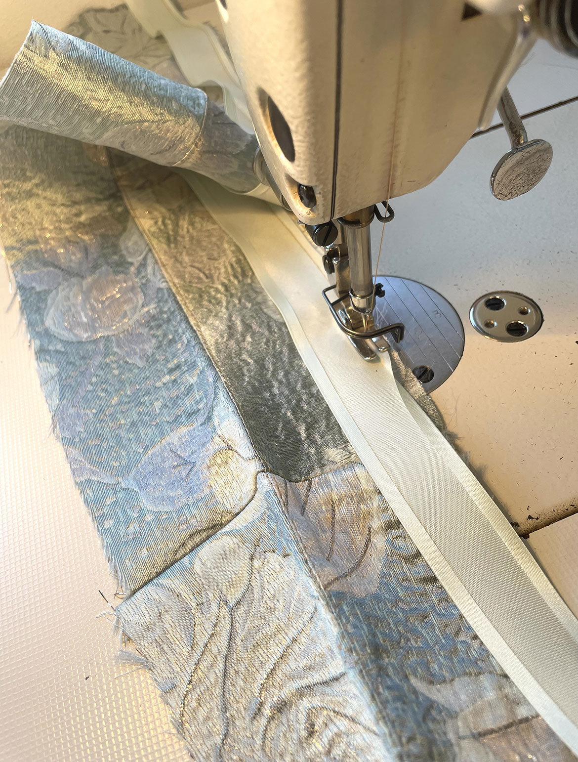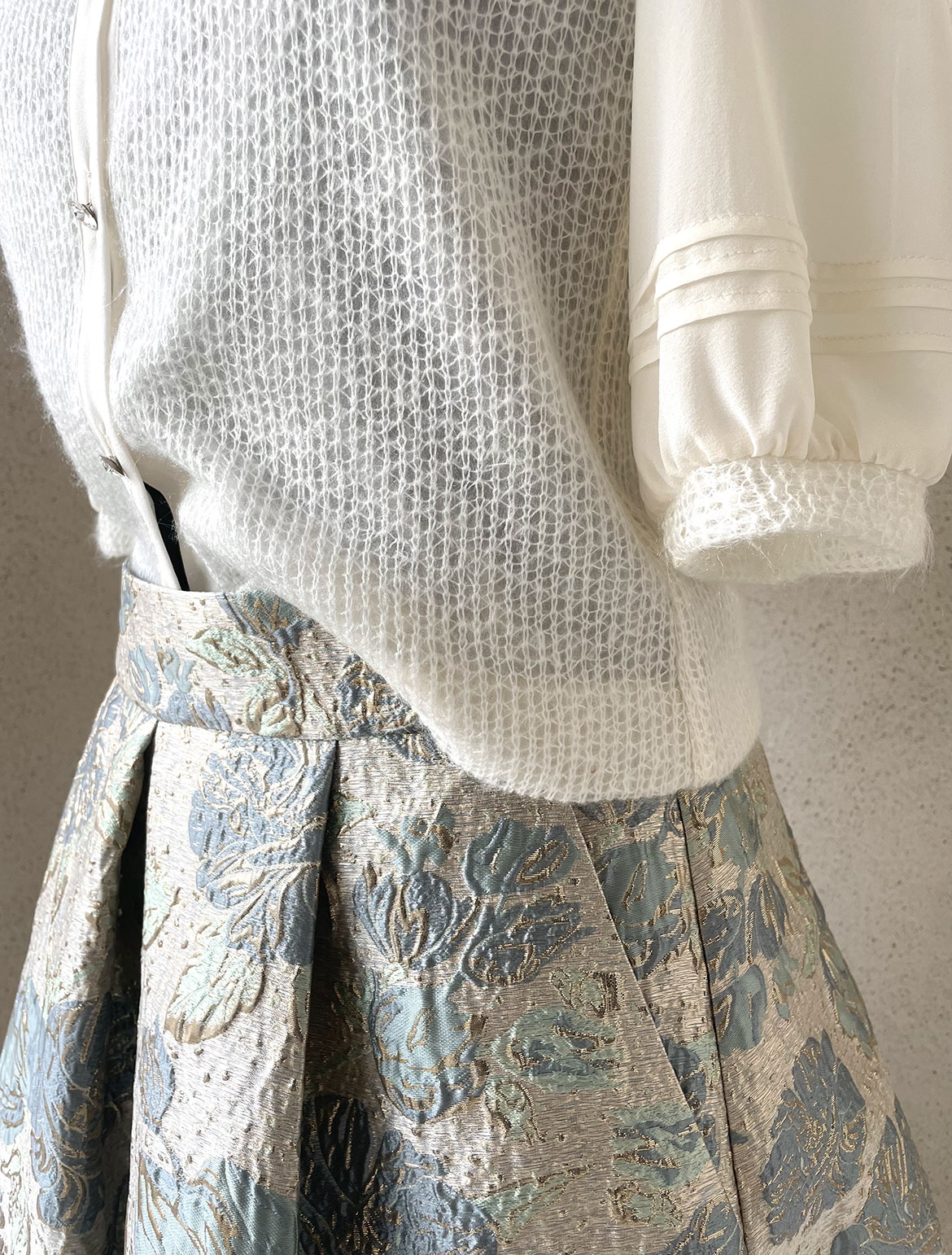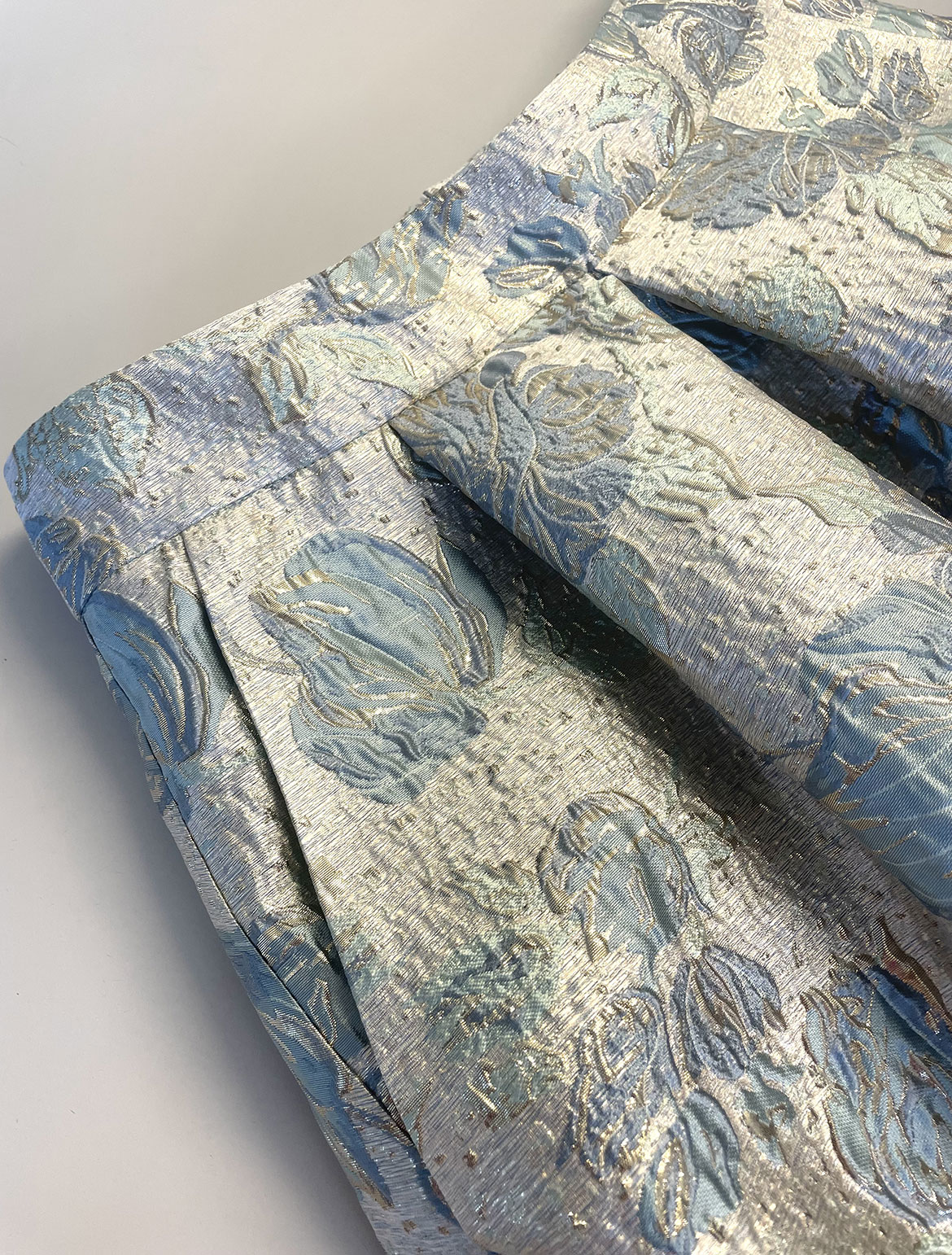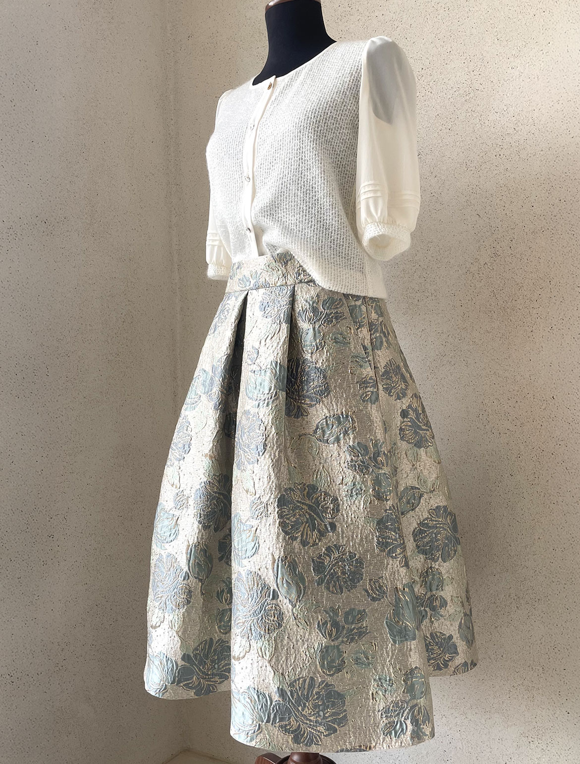 - Mintgoldfarbiger wunderschöner Brokatrock mit tiefen Falten und Eingriffstaschen, sowie kleinen goldfarbigen Knöpfchen im Rücken