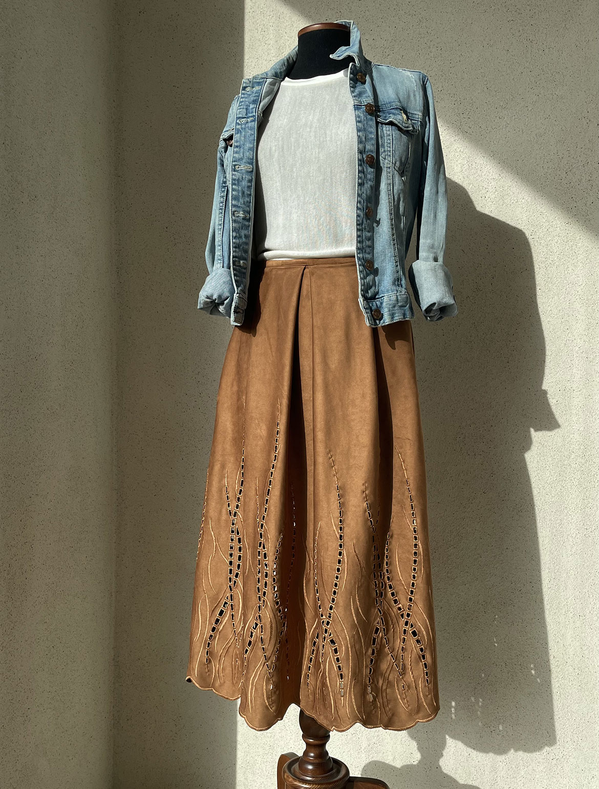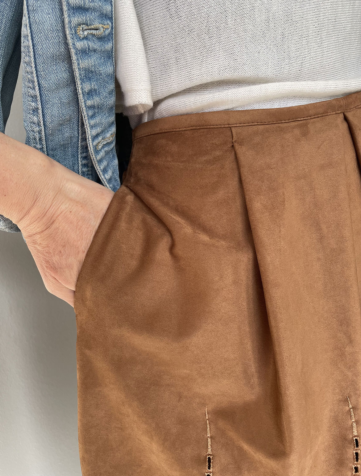 - brauner weicher Alkantaralederrock“ mit Scherenschnitteffekt am Saum, Eingriffstaschen, leicht abgefüttert