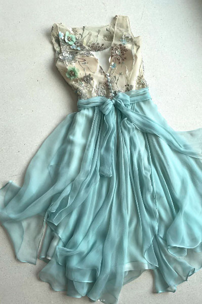 Die Taille ist mit einer breiten, fließenden Schleife aus helltürkisfarbenem Chiffon betont, die das Kleid optisch gliedert und ihm eine verspielte Note verleiht.