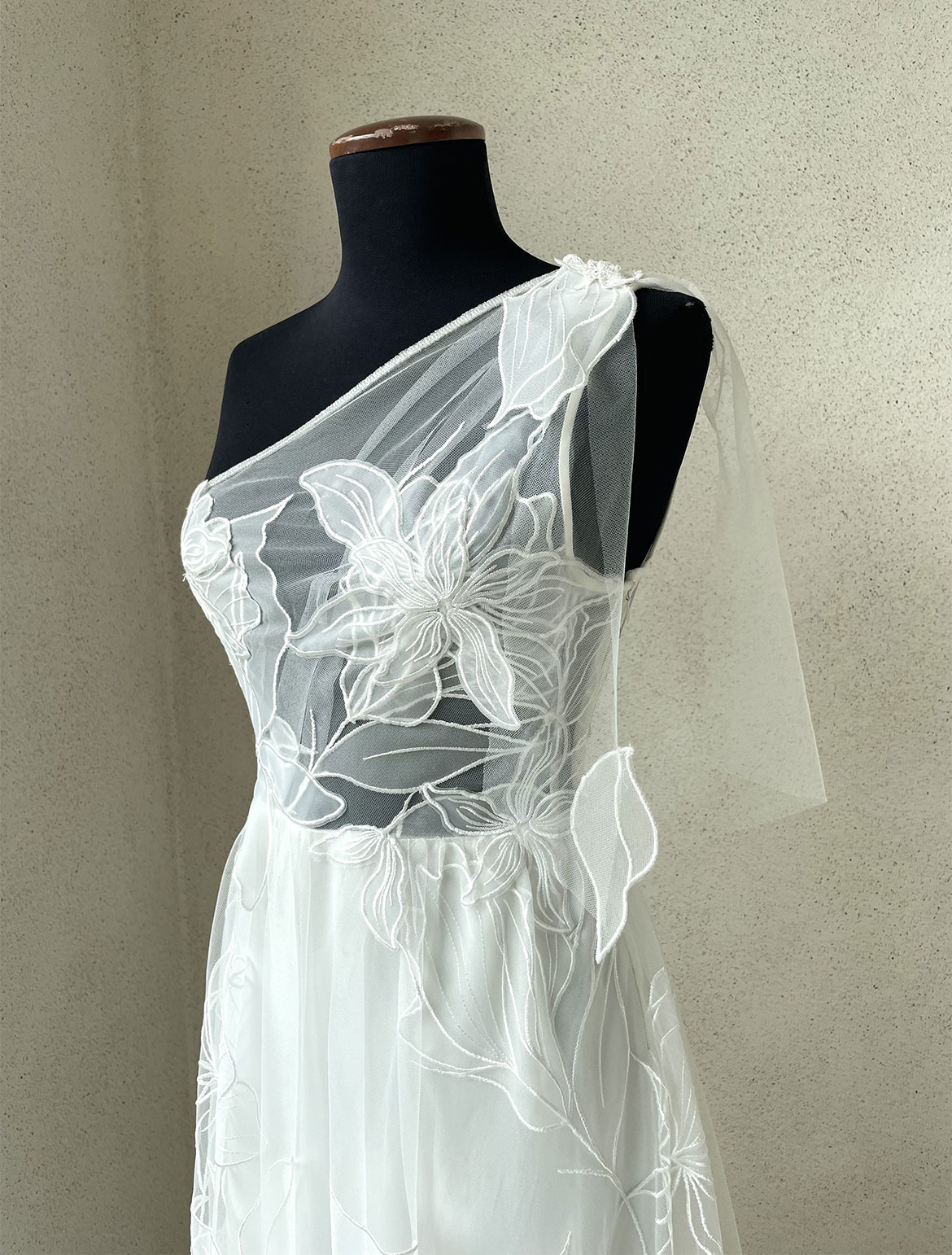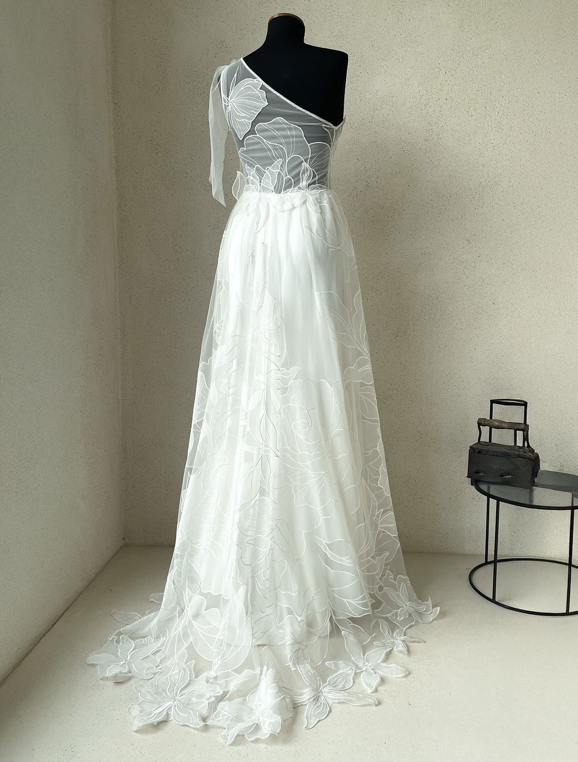 - Assymetrisches Softbrautkleid aus trasparenter moderner Spitze
