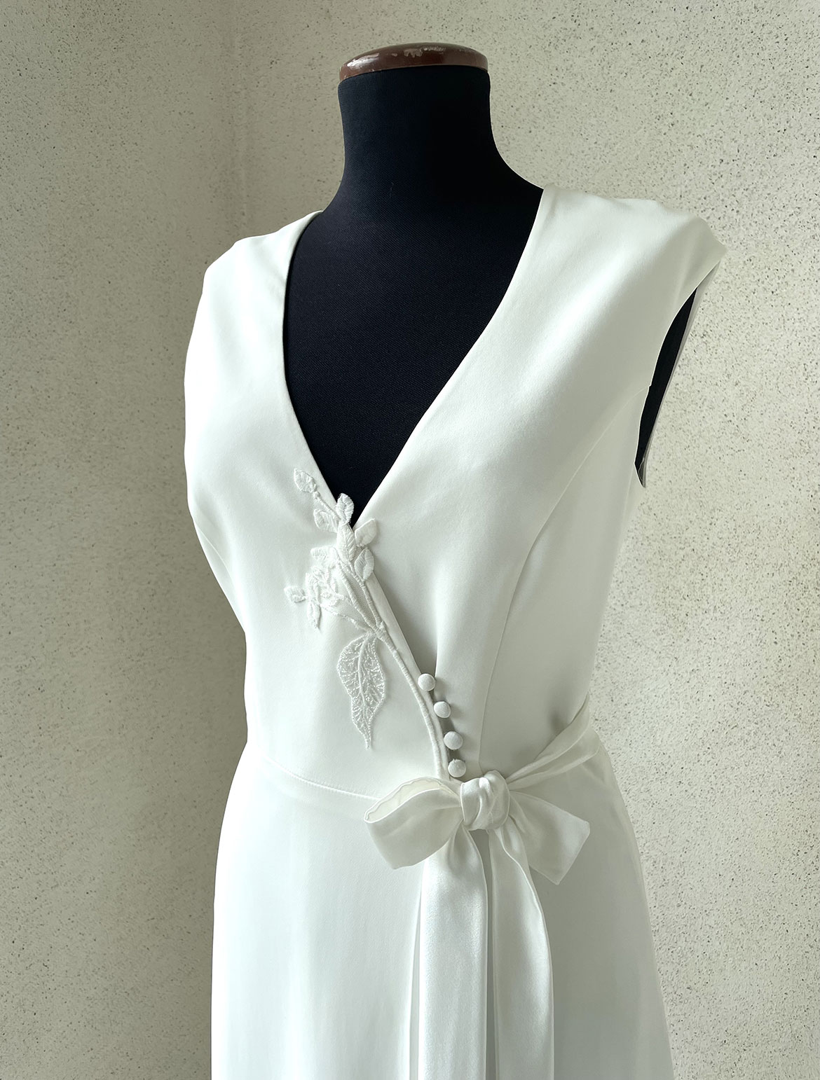 - Schlichtes Brautkleid mit dezenter Stickerei im Vorderteil, Wickelkleid